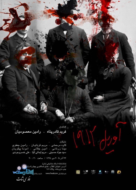 نمایش آوریل 1912 به کارگردانی فرید قادرپناه و رامین معصومیان قرار است از یکشنبه 22 آذر 94 تا چهارشنبه 30 دی ماه 94 ، همه روزه از ساعت 20/30 در تماشاخانه استاد جمشید مشایخی واقع در ضلع شمال غربی چهارراه ولیعصر ،پلاک 1478 اجرا شود .IMG_20151212_112001